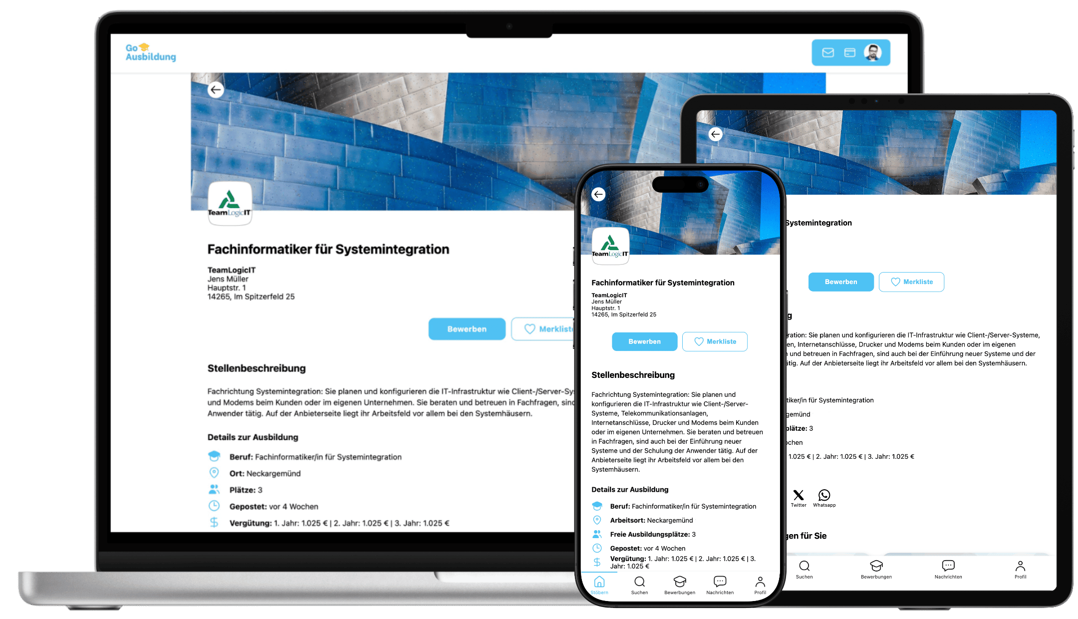 Our platform is available as an app for Android and iOS. This allows you to search for Ausbildungs, find applicants, or make connections anytime and anywhere - directly from your smartphone.